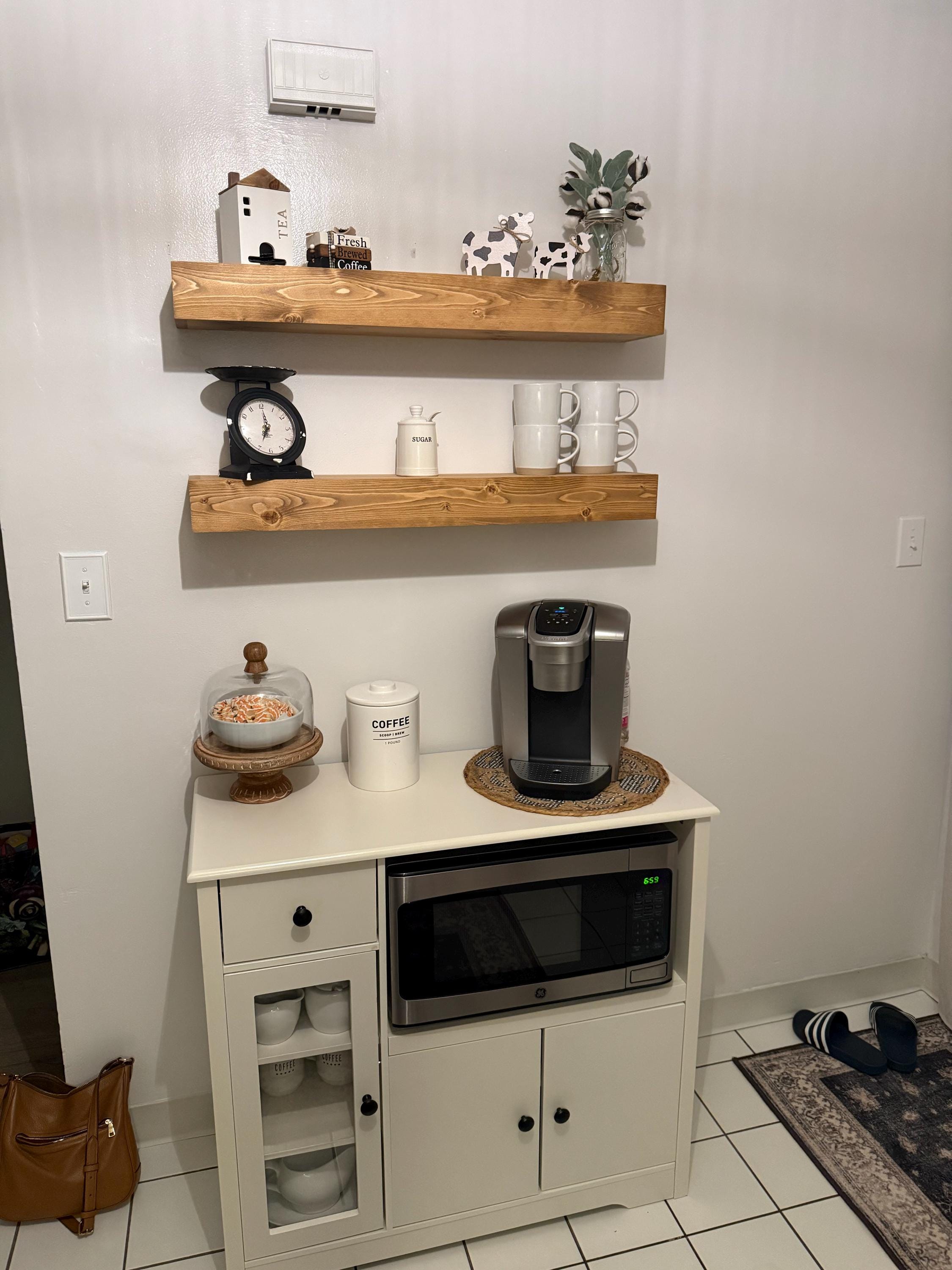 The shelves are beautiful and pretty easy to install. They also sent me the extra drywall screws for extra support because I requested ahead of time. They arrived about a week later than expected because of FEDEX for some reason hold them, so that isn’t the sellers fault. I love the way they turned out.